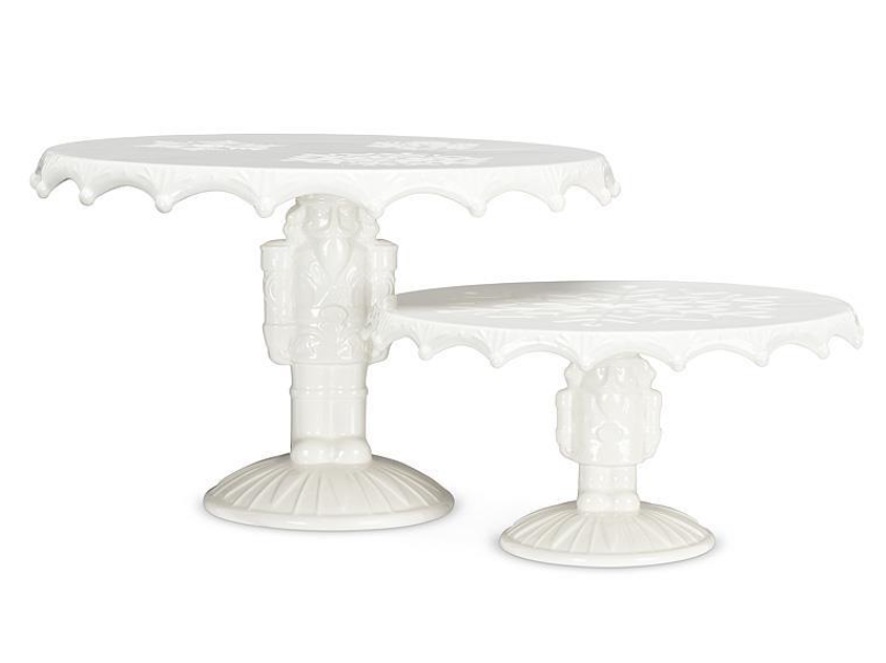 This Large Nutcracker Pedestal Cake Plate combines festive charm with elegant design, featuring a delicate snowflake pattern and a whimsical nutcracker motif. The 6 1/2" high raised pedestal adds a touch of sophistication, making it perfect for showcasing holiday desserts. A delightful centerpiece for any seasonal gathering or winter celebration.