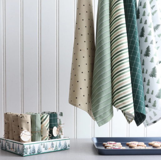 THIS WINTER GREEN KITCHEN TOWEL ASSORTMENT, MADE FROM COTTON, IS GIFT READY!