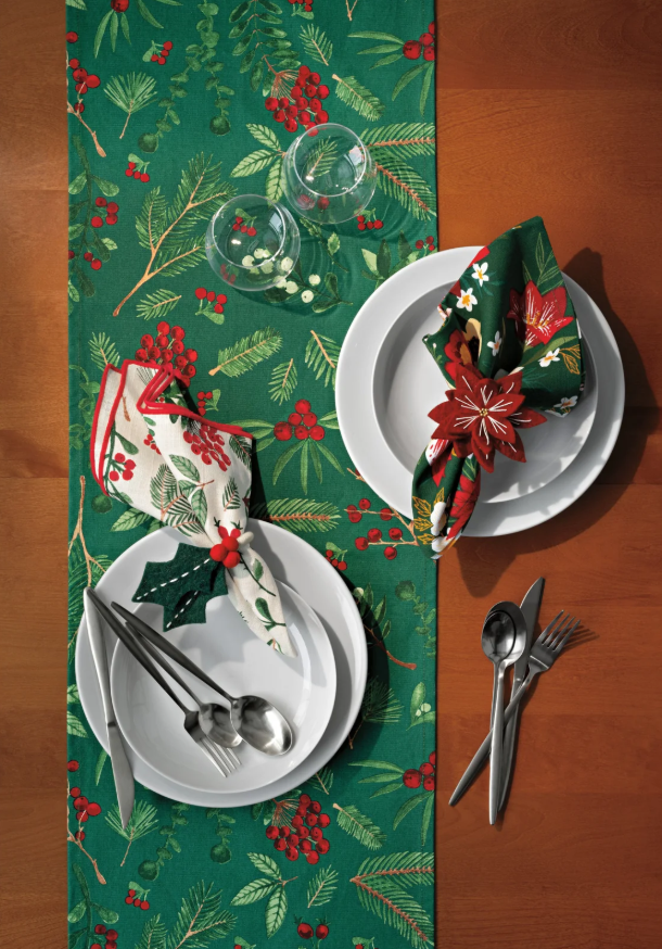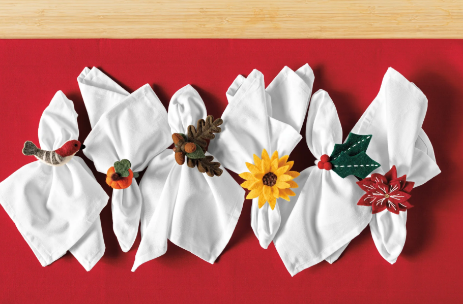 Our handcrafted felted wool Winterberry napkin ring adds a soft touch of seasonal charm to the table. Delightful red berries and delicate evergreen branches bring a naturally appealing element home for the Christmas holidays.