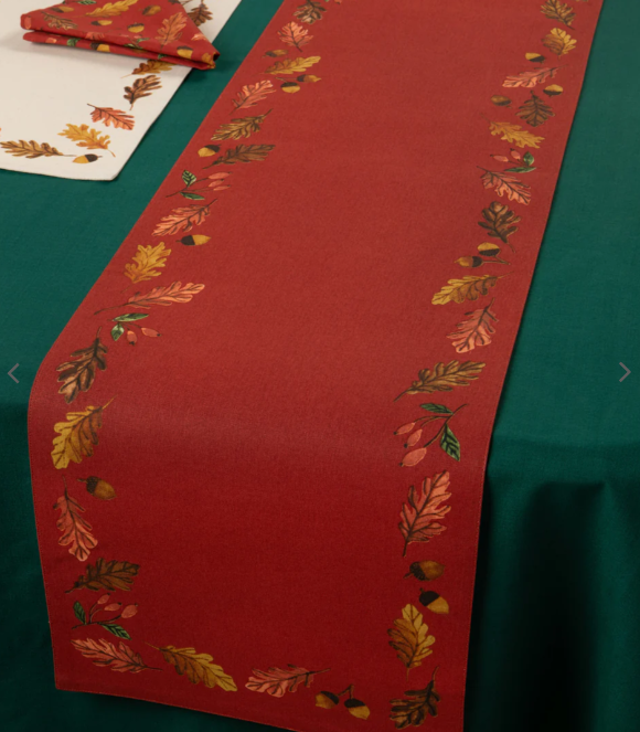 The Oak and Acorn table runner is a fun and easy way to decorate your dining room table, especially during the holiday season. Descending from the mighty oak tree, tiny acorns and autumn-bright leaves scatter autumnal joy wherever they land. This design will fill the home with the feeling of Fall.