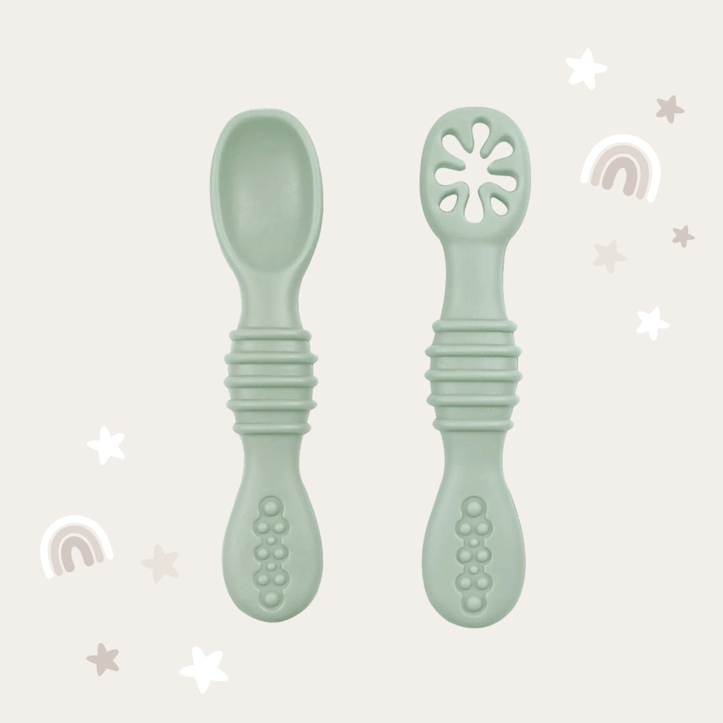 Introducing our first stage baby feeding utensils specifically designed for self-feeding and baby-led weaning. - 1 Silicone Training Spoon: has a groovy opening for catching puree and mashed foods. - 1 Silicone Spoon: for babies to learn how to scoop food. Soft to the touch with a unique non-slip grip and and soothing on your baby's gums as they explore the world of solids. Designed in Canada, this infant feeding set promotes independence through self-feeding and helps develop hand-eye coordination and fine motor skills. Details: - 100% food-grade silicone - BPA, PVC, BPS, Lead, and Phthalate free - Dishwasher & Sterilizer Safe