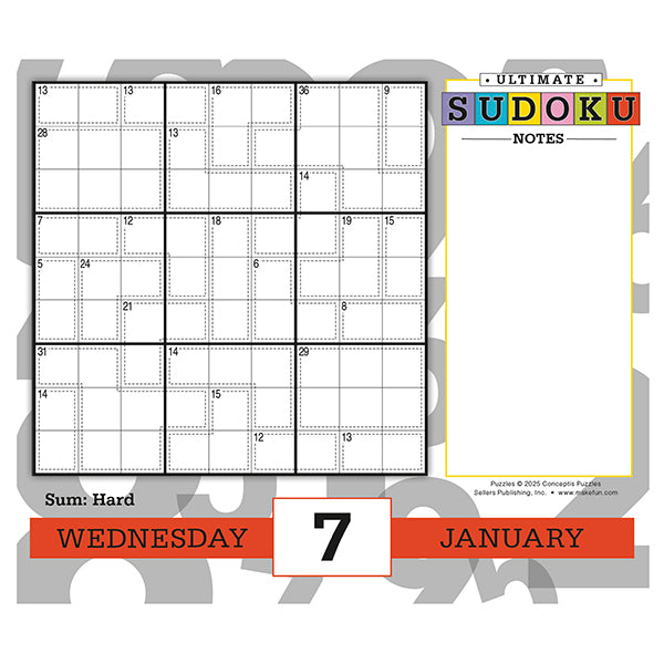 Ultimate Sudoku provides hours of entertainment while sharpening your mind. With a mix of puzzle variations to challenge all levels, such as IRREGULAR, DIAGONAL, and SUM SUDOKU, each page provides a unique puzzle to solve. Ultimate Sudoku is the perfect calendar for those who enjoy testing their puzzle skills and strategies.